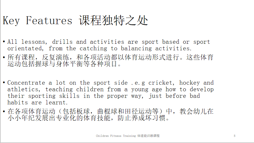 在各项体育运动(包括板球,曲棍球和田径运动等)中,教会幼儿在小小年纪发展出专业化的体育技能,防止养成坏习惯。所有课程,反复演练,和各项活动都以体育运动形式进行。这些体育运动包括握球与身体平衡等各种项目。纯外教教学,让小朋友在运动中强化锻炼英语口语