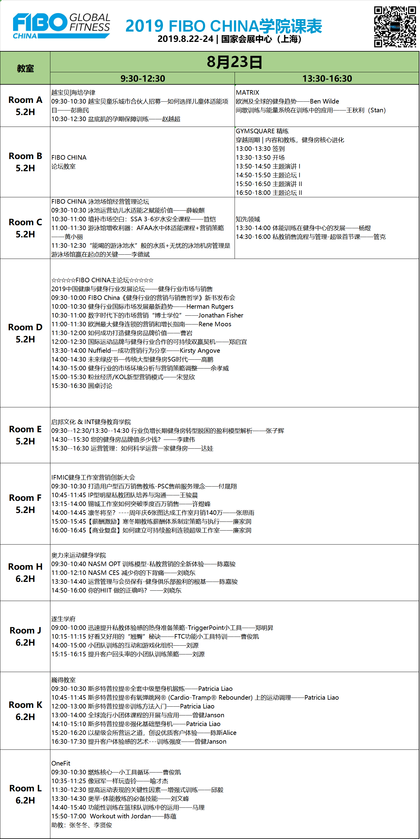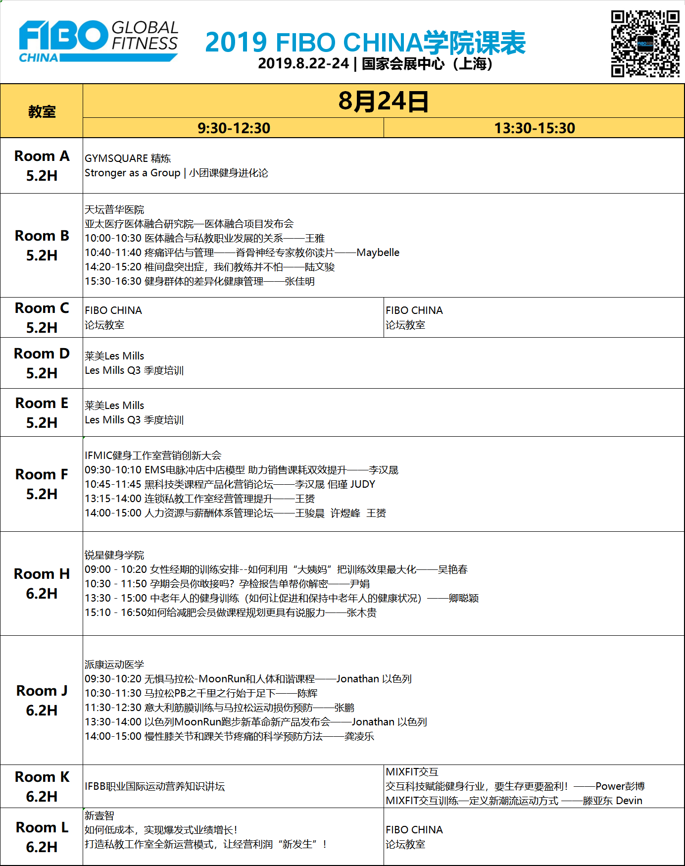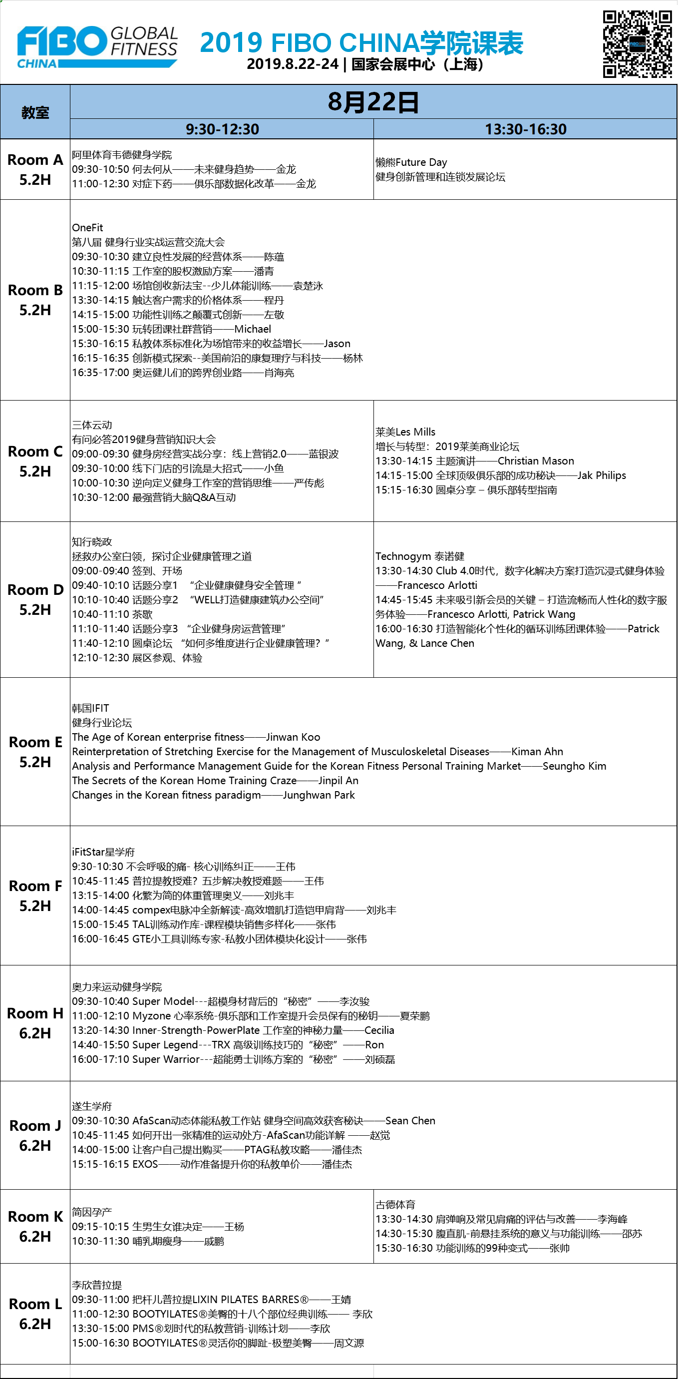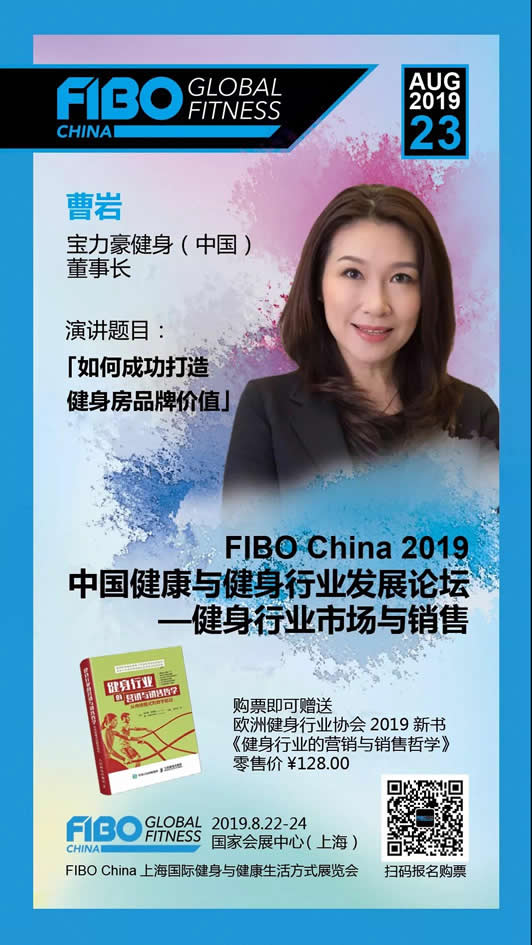 另外,FIBO CHINA学院将结合2019年全球最新趋势,举办其他16场涉及行业最前沿趋势的管理论坛,主题涉及企业员工管理、医体结合、青少年体育发展、泳池管理及水中健身、运动营养、投融资及跨界经验分享、商业健身房管理、私教管理及工作室经营等多版块细分话题。