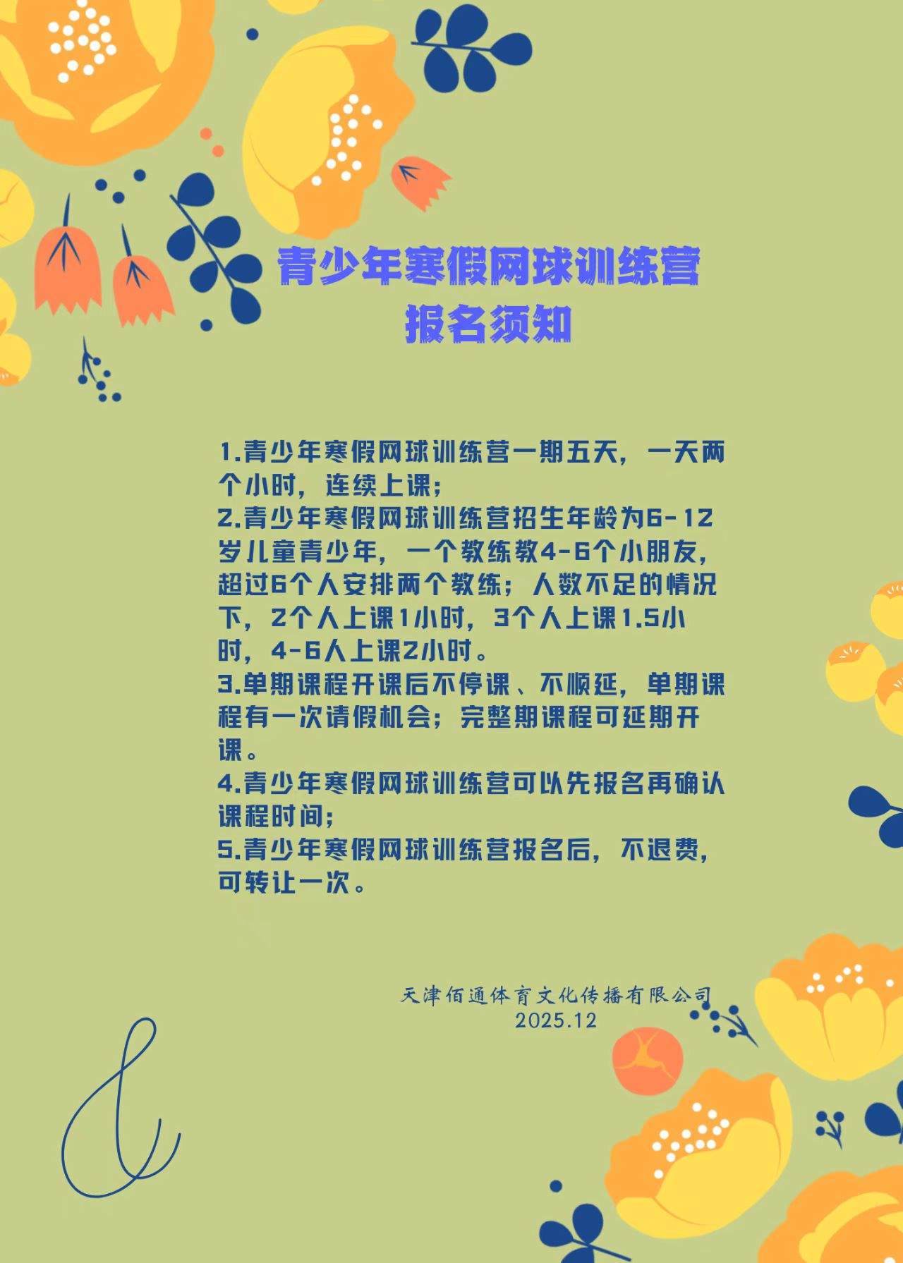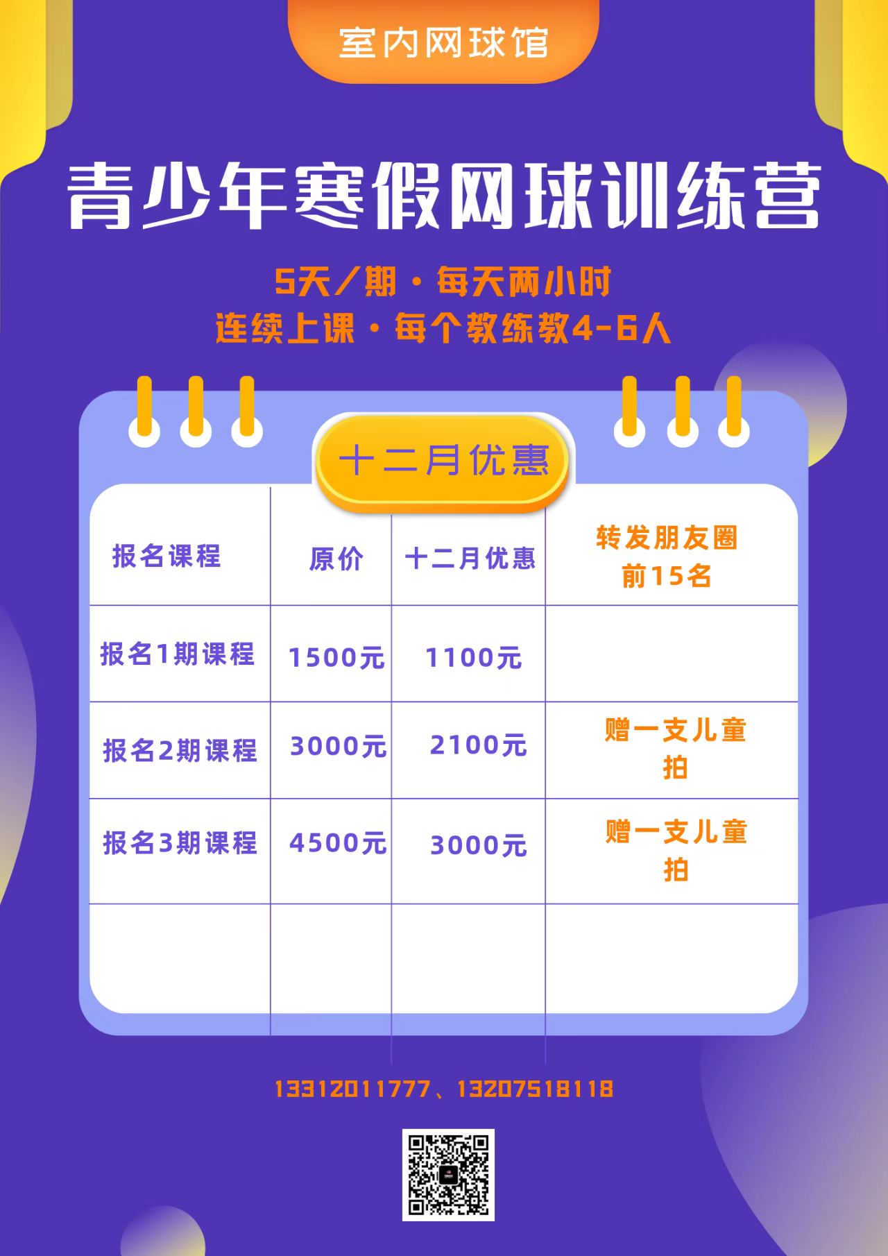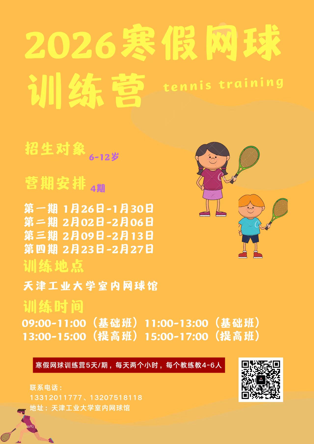 寒假来袭,冬季训练营不仅可以提升体能/强化技能/挑战比赛,同时训练营更易于培养孩子的运动兴趣和锤炼意志。我们根据年龄、运动能力、技术水平进行分组,本冬训营我们针对学员专项身体素质、网球基本技术、对抗比赛策略重点学习与强化训练。同时通过运动能力的进一步提升和网球技能的完善,使其获得正确的自我价值感,结合训练前后团队活动培养队员自信、勇敢、坚毅、协作的可贵品质。在失败与成功心态的转变中努力塑造自我同时学会接纳未来不可预期的可能。