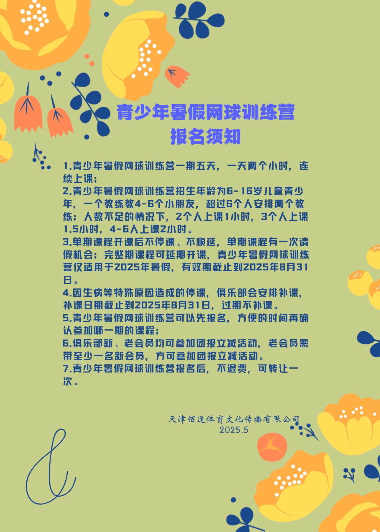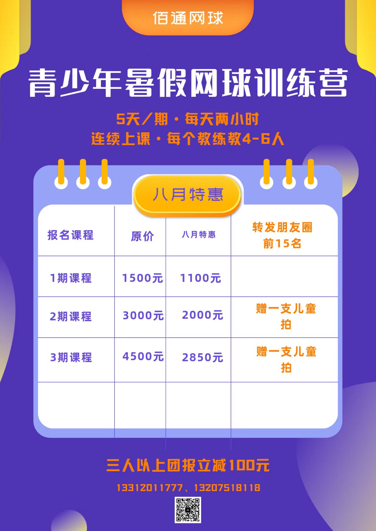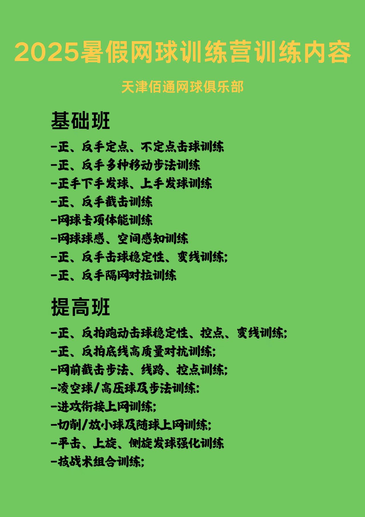 ——佰通网球常年开设少儿启蒙班、青少年基础长训班、青少年提高进阶班,成年人网球初级班、一对一私教,网球特长升学规划训练课程,欢迎垂询!